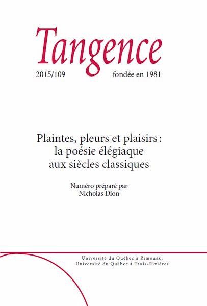 En outre, dès les arts poétiques de la Renaissance, et ce jusqu’à la fin du siècle des Lumières, l’élégie côtoie constamment d’autres formes littéraires dans les textes théoriques, qu’il s’agisse de souligner la porosité des critères génériques ou bien de mettre de l’avant une tonalité, un registre élégiaque susceptible de transcender ces mêmes critères. L’élégie et l’élégiaque revêtent ainsi à l’âge classique plusieurs traits stylistiques et poétiques que le présent dossier souhaite analyser, interroger et mettre en perspective.