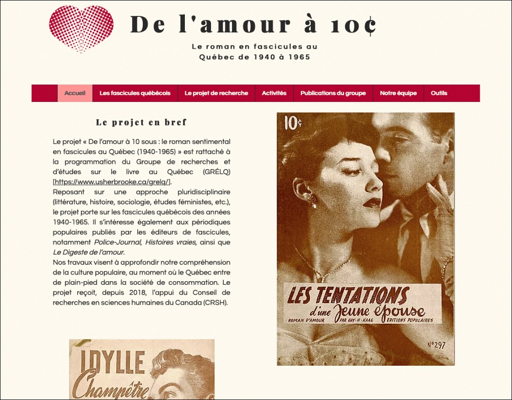 Le projet de recherche « De l'amour à 10 sous : le roman sentimental en fascicules au Québec (1940-1965) » est rattaché à la programmation du Groupe de recherches et d’études sur le livre au Québec (GRÉLQ). Le site Internet a été réalisé par l'Agence-école en communication de l'Université de Sherbrooke.