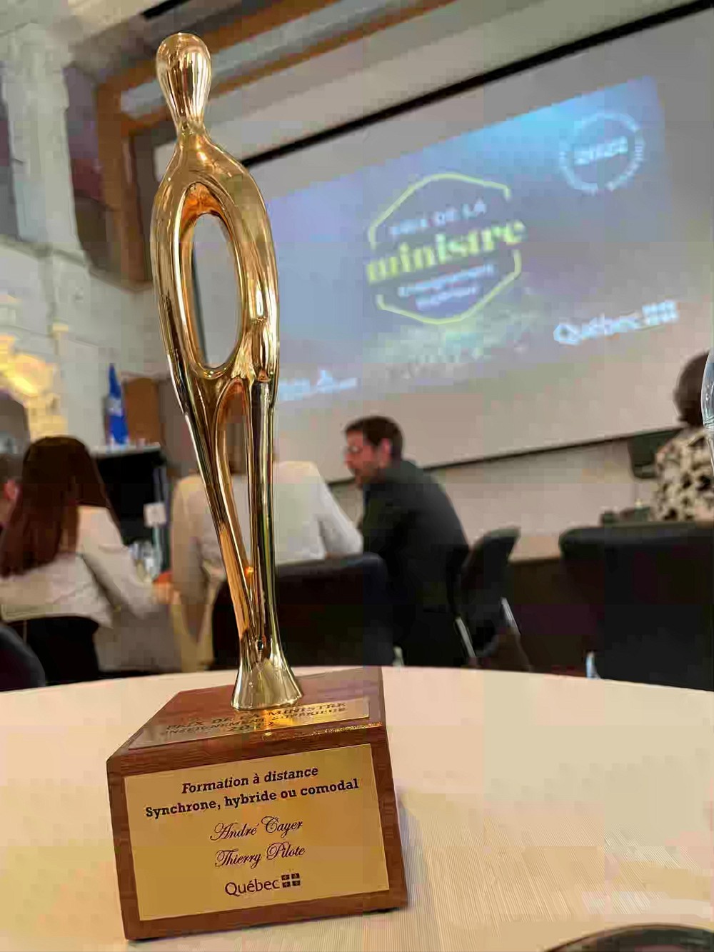 Le 13 mai dernier, le professeur André Cayer et le chargé de cours à forfait Thierry Pilote ont fièrement reçu le Prix de la ministre en enseignement supérieur, volet formation à distance synchrone, hybride ou comodale, des mains de la ministre Danielle McCann.