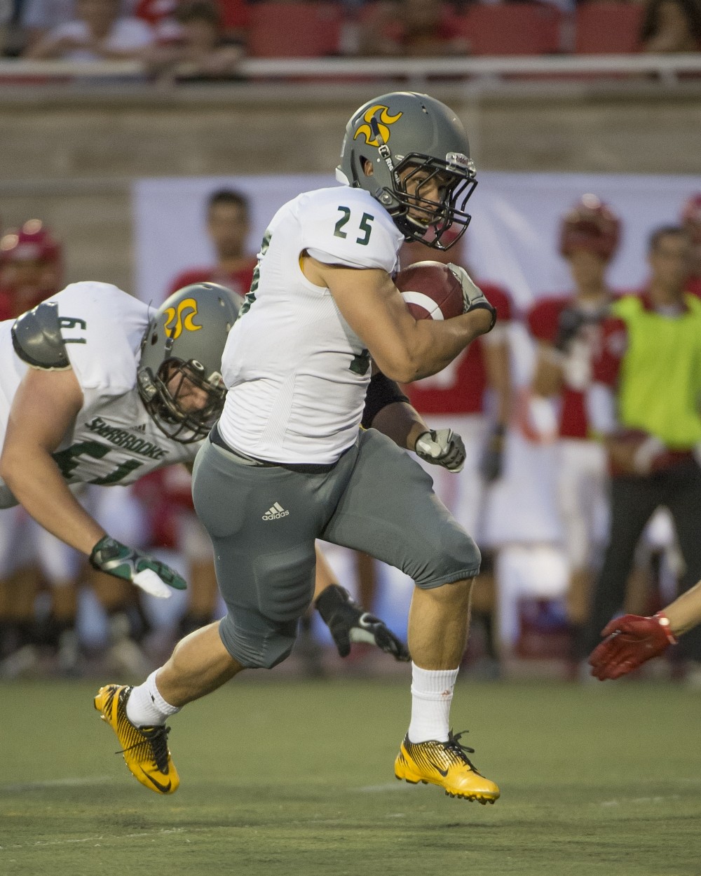 Les joueurs du Vert & Or ont trouvé le moyen de faire oublier leur difficile sortie de la semaine dernière face aux Carabins de l’Université de Montréal en dominant complètement les Redmen de l’Université McGill, vendredi soir au stade Molson. Les Sherbrookois n’ont jamais levé le pied de l’accélérateur, procurant du même coup une première victoire à leur entraîneur David Lessard. Un gain sans appel de 46 à 14.