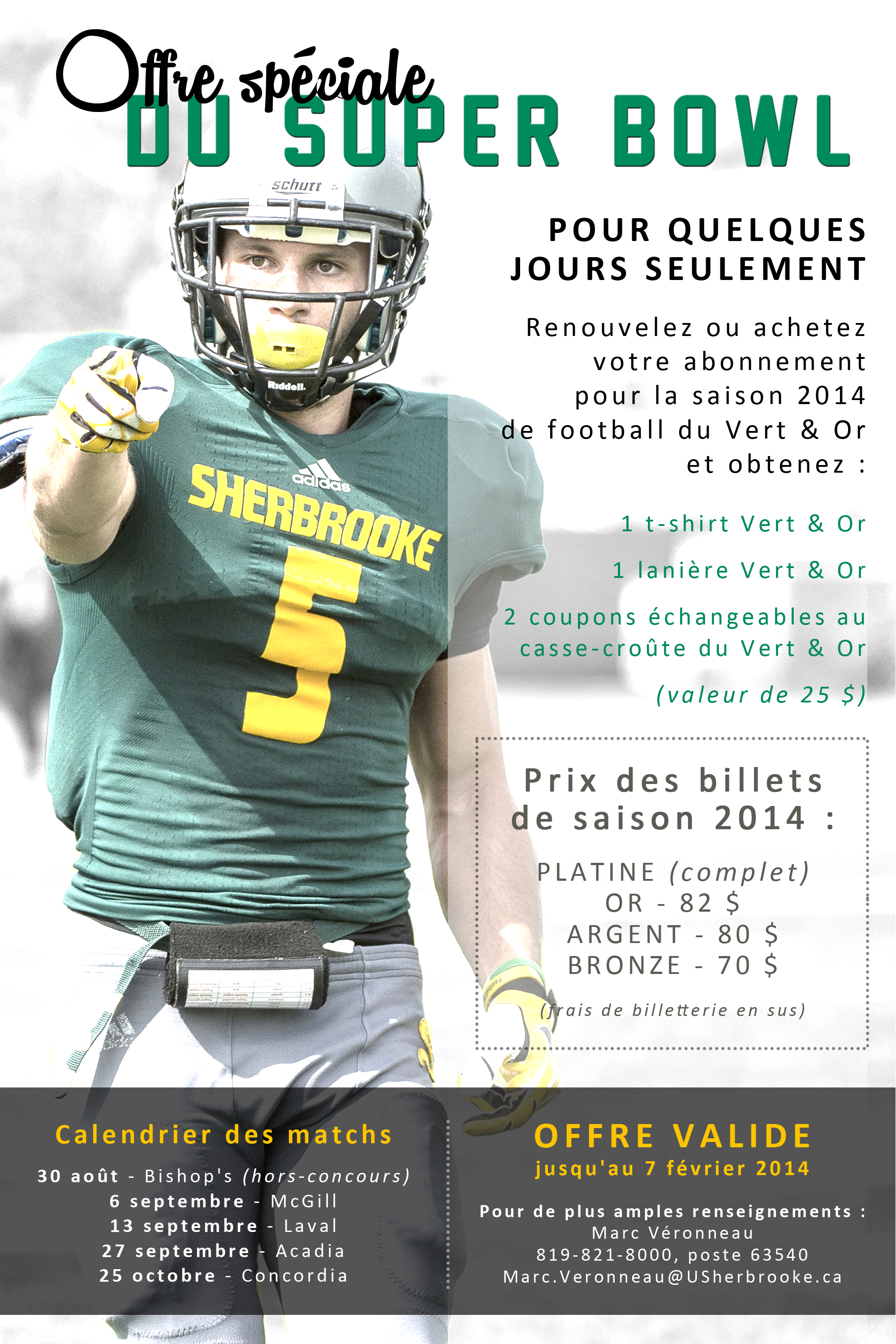 Cette offre spéciale, en marge du Super bowl de la NFL qui vient de se conclure par la victoire des Seahawks de Seattle sur les Broncos de Denver, permettra aux acheteurs d'un abonnement de saison de mériter un t-shirt et une lanière du Vert & Or, ainsi que deux coupons échangeables au casse-croûte du stade de l'UdeS.