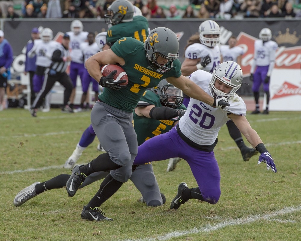 En fin de première demie, les représentants de l’Université Bishop's se sont signalés à leur tour grâce à un rabattement du quart-arrière et une interception. Le numéro 6 des Gaiters, Trevon Millings, réalisait ensuite le touché, si bien que les deux équipes retraitaient au vestiaire avec une marque de 26-18 en faveur des locaux.
