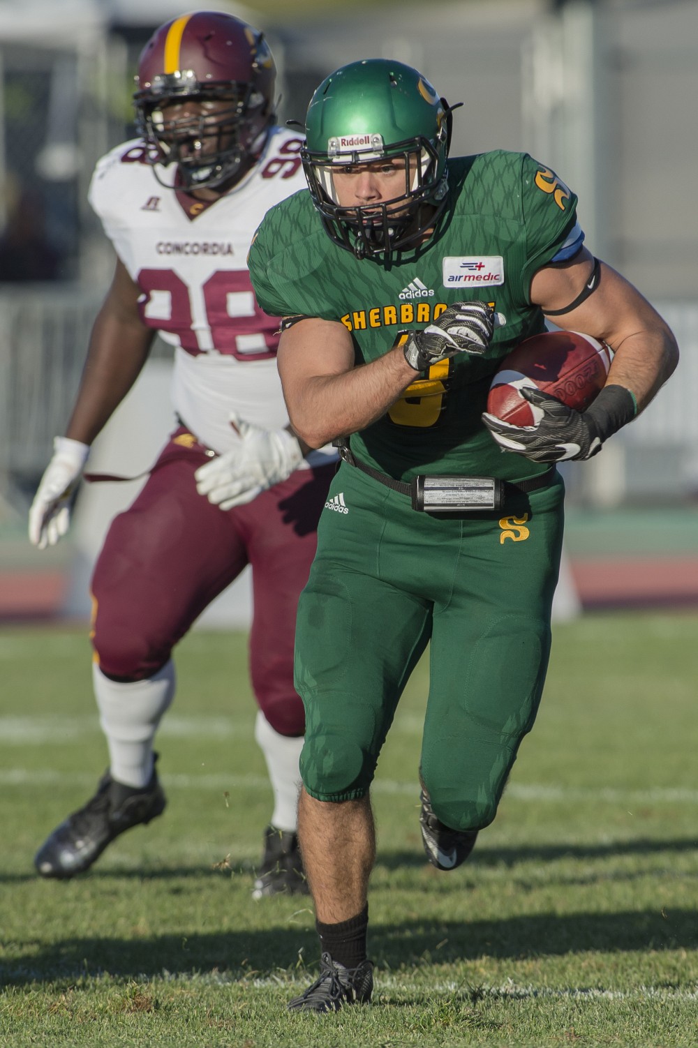 Les joueurs de footballeurs de l’Université de Sherbrooke ont savouré une neuvième victoire de suite à la maison face aux Stingers de Concordia samedi. Ce gain de 43-17, obtenu devant 3672 partisans ravis, est d’une importance capitale dans la course pour une place en séries, puisqu’il place le Vert & Or devant les Redmen de McGill. Ceux-ci occupaient avant le match la quatrième et dernière position donnant accès aux éliminatoires, au classement du circuit universitaire québécois de football. Le Vert & Or devance même temporairement les Stingers au troisième échelon, avec encore deux matchs à jouer.
