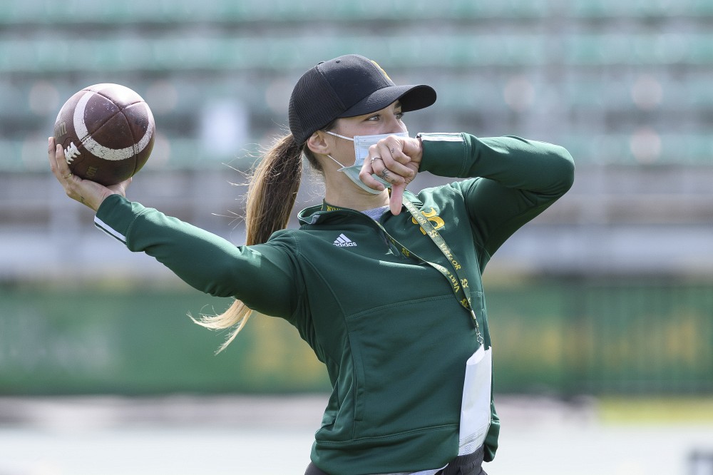 Ariane Chiasson en est à sa deuxième année au baccalauréat en kinésiologie à la Faculté des sciences de l’activité physique, mais le lien qui l’unit à l’Université de Sherbrooke dépasse largement le cadre académique. En effet, la jeune femme, qui célèbre aujourd’hui ses 22 ans, agit depuis la fin de l’été à titre d’adjointe à l’offensive au sein du personnel d’entraîneurs de l’équipe de football Vert & Or en plus de prêter main forte depuis plusieurs mois au préparateur physique des footballeurs de l’UdeS, Louis Leclerc.