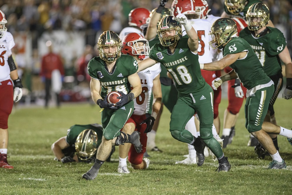 Quatrième quart, un peu plus de 8 minutes à faire : McGill ne réussit pas à maîtriser un retour de botté de dégagement. Alexandre Karl Boudreau du Vert & Or se lance et le recouvre, dans la zone de touché de Sherbrooke – c’est 17-13 Vert & Or.