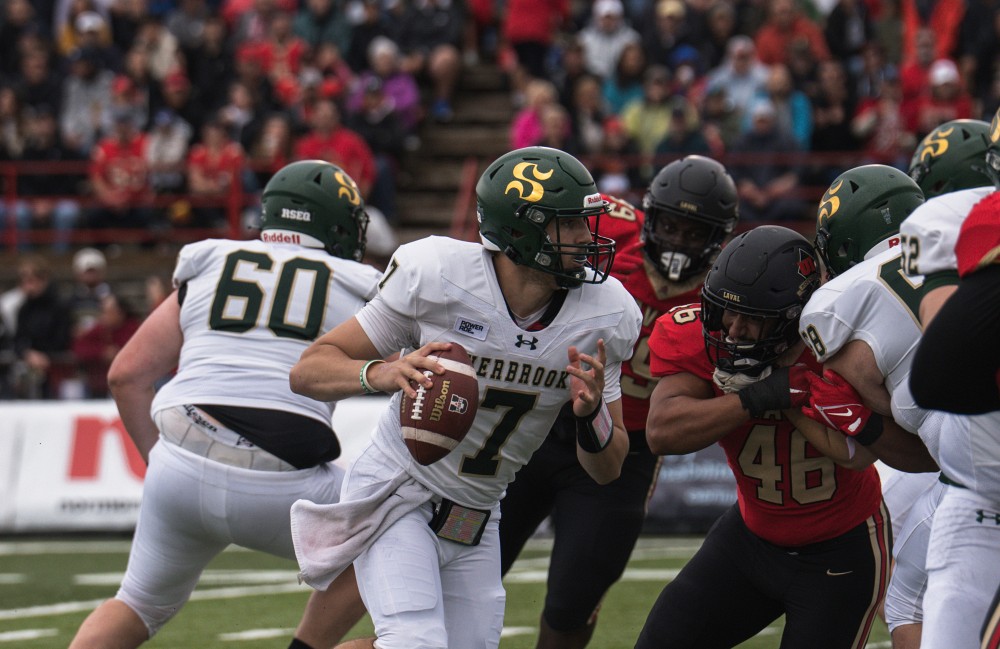 La ligne défensive s’est illustrée avec une pression constante sur le quart-arrière adverse, réussissant un total de quatre sacs du quart grâce aux efforts de Charles-Antoine Ledoux, William St-Laurent (provoquant aussi un ballon échappé) et Mathieu St-Pierre à deux reprises. Une intensité défensive qui a permis de limiter plusieurs séquences offensives de leurs adversaires.