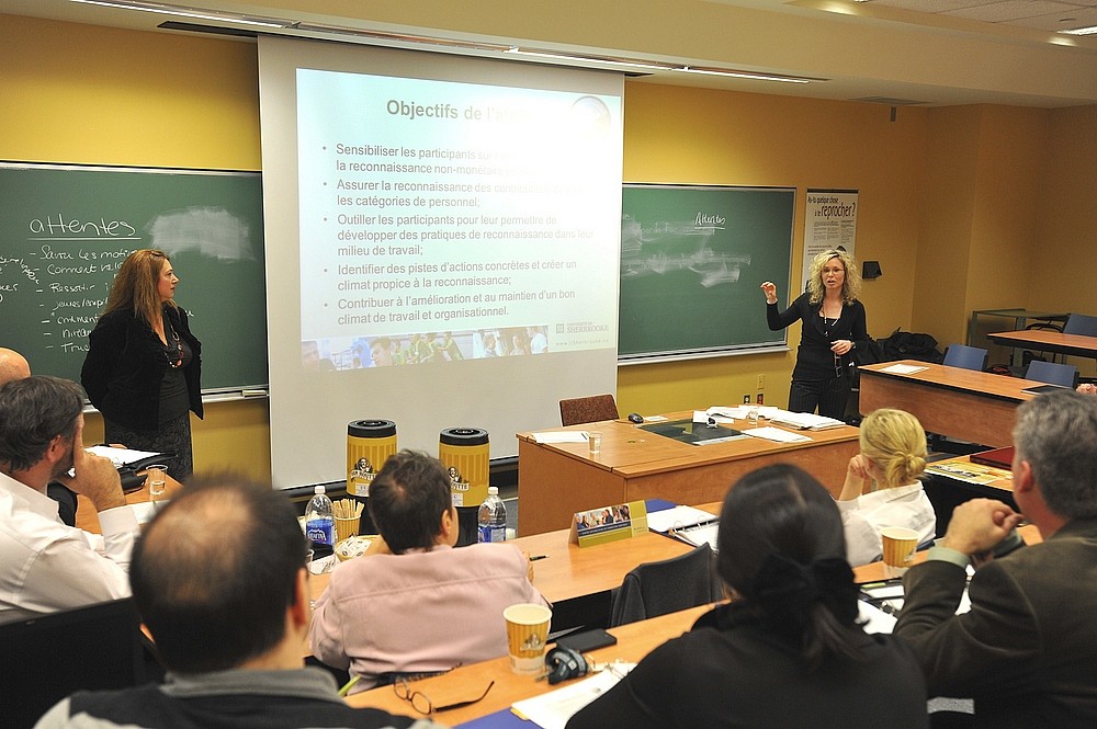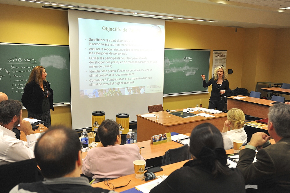 Cohorte après cohorte, tous les gestionnaires de l'UdeS sont invités à s'investir dans le Cheminement d'intégration des connaissances et des compétences au rôle stratégique de gestionnaire à l'Université de Sherbrooke (CICCUS). Il s'agit d'un programme de formation continue bâti par la Direction des ressources humaines en collaboration avec le Centre universitaire de formation continue du Service de soutien à la formation. Il vise à développer le plein potentiel de toutes les personnes qui agissent à titre de gestionnaires à l'UdeS afin qu'elles puissent contribuer au développement de l'organisation et des personnes qui y œuvrent, et ce en harmonie avec la mission, les valeurs et la vision de l'institution.