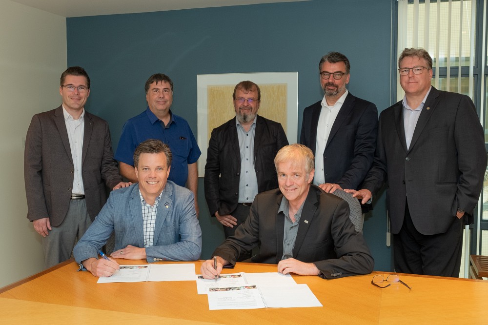 L’entente de contribution d’EXP au Studio de création – Fondation Huguette et Jean-Louis Fontaine a été signée le 30 juillet 2019 en présence de, à l’avant, Patrik Doucet, doyen de la Faculté de génie, et Gaétan Couture, et à l’arrière, tous de EXP, Simon Houle, Sylvain Alary, Sébastien Girard, Dominique Nadeau et Donald Bonsant.