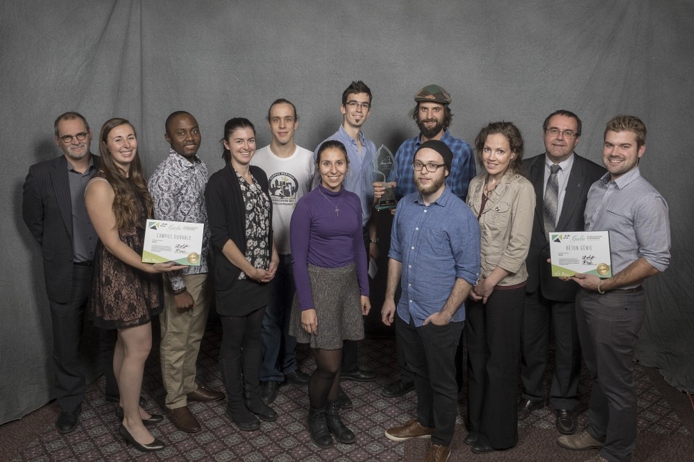 Finalistes de la catégorie Relève, de gauche à droite: Alain Webster, administrateur de la Fondation estrienne en environnement (FEE) et vice-recteur au développement durable et aux relations gouvernementales de l’UdeS, Sophie Valence-Doucet, Christian Kengne, Stéphanie Boisvert, Michel Scultéty-Ouellet et Arielle Guindon-Grenon de Campus Durable, Dragan Tutic et Renaud Lafortune d'Oneka Technologies, Marc-André Plante (avant) et Corinne Duff-Talbot de Campus Durable, Denis Poirier, administrateur FEE, ainsi que Jean-Martin Lessard de Béton Génie.