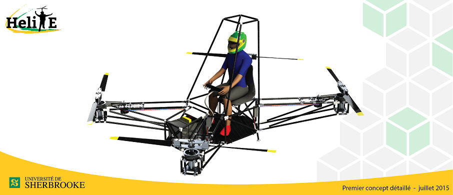« Ce drone géant transportera une personne de 80 kg de manière confortable et bénéficiera d’une autonomie d’environ 15 minutes de vol à l’aide de batteries au lithium-Ion », explique Samuel. Pesant moins de 115 kg avec les batteries, cet engin volant sera composé de commandes électroniques, de pales légères adaptées à nos conditions de vol et de moteurs électriques. En grande primeur, il sera présenté les 7 et 8 décembre prochains lors de l’Expo MégaGÉNIALE 2016 qui se déroulera au Centre culturel de l’UdeS.
