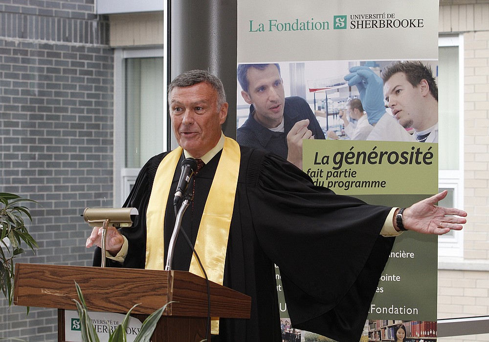 Jean-Marc Donahue, diplômé d'une maîtrise en commerce de 1960, représentait les diplômés cinquantenaires. Son discours enthousiaste et fier en a conquis plus d'un. « Nous faisons tous partie de la grande famille de l'UdeS, a-t-il déclaré. À ce titre et tout comme dans nos cocons familiaux où l’entraide prévaut, nous avons un rôle de « grands-frères » et de « grandes sœurs » à assumer auprès des étudiants présents et futurs. Je vois là un pont entre le passé et l’avenir, entre ce qui a été réalisé et ce qui reste à faire. C’est un geste solidaire de grande valeur, à la fois stimulant et vivifiant, qui nous permet de reconnaître ce que l’Université de Sherbrooke nous a donné. »