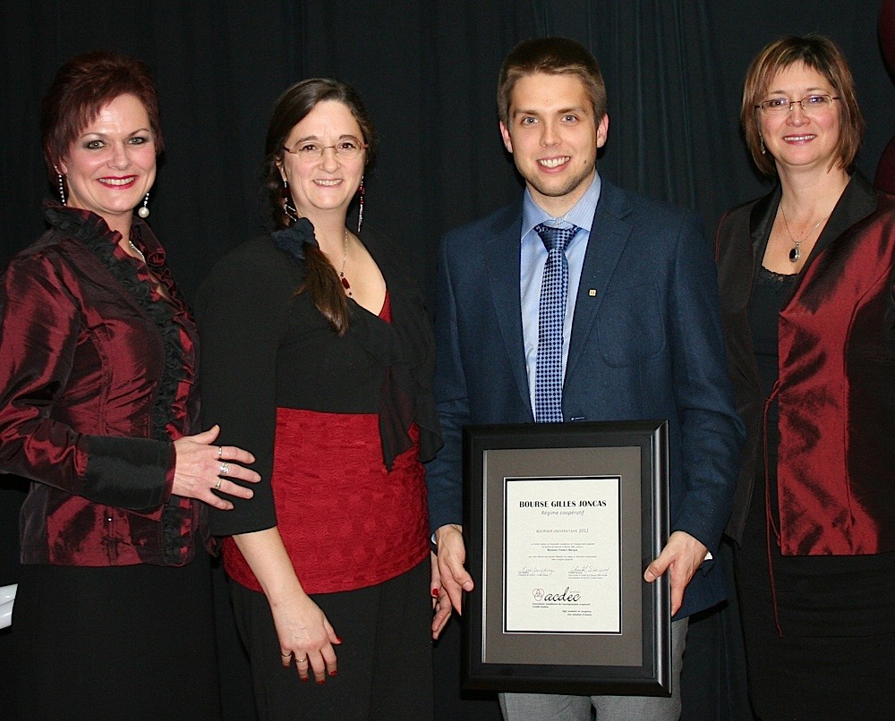 Chantale Sincerny, vice-présidente de l’ACDEC-Québec; Sylvie Cayouette, coordonnatrice de stages à l’UdeS; Frédéric Marquis, récipiendaire de la bourse Gilles Joncas; et Lise Geoffroy, présidente de l’ACDEC-Québec.
