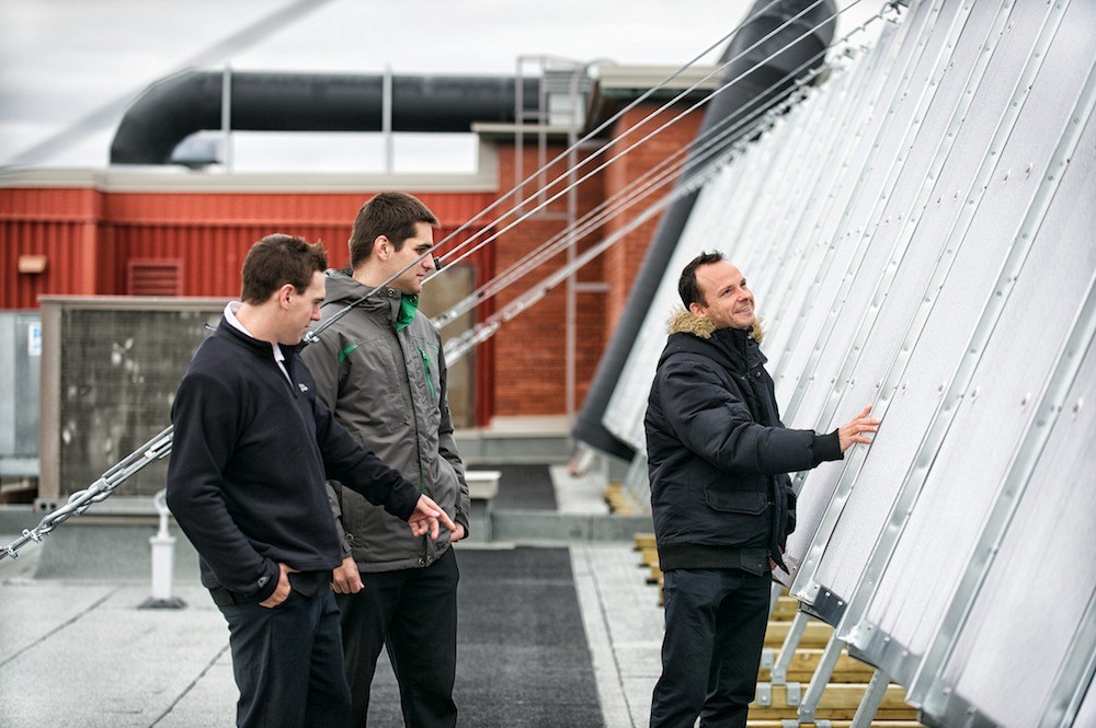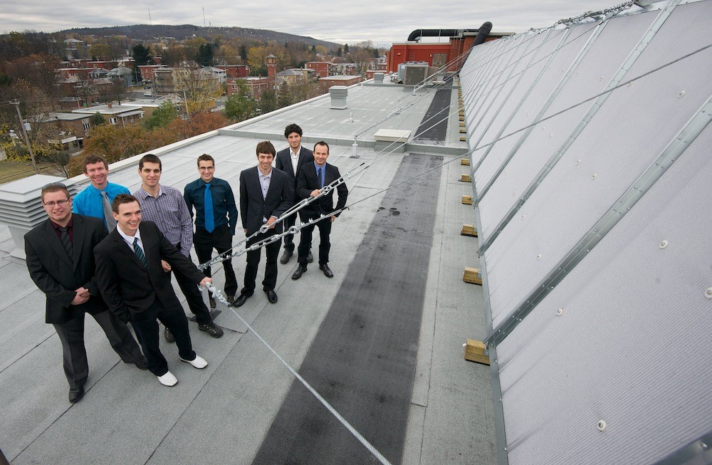 Quand on parle d’effet de serre, on pense généralement aux gaz relâchés dans l’atmosphère qui contribuent au réchauffement climatique. Des étudiants en génie mécanique ont décidé d’aborder la chose autrement en appliquant le principe de l’effet de serre à une autre échelle. Ils ont installé un capteur qui permet de maximiser l’effet du soleil dans une série de cases vitrées sur le toit d’un hôpital de Sherbrooke. En récupérant l’air chauffé naturellement, il parviennent à réduire la facture de gaz naturel de cet établissement de santé de quelque 15 700 $ par année. Cette idée, en apparence relativement simple, a été raffinée et mise à l’épreuve avec succès par les huit étudiants du projet ARES – Air réchauffé par l’énergie solaire. Depuis deux ans, ils ont réalisé les différentes phases de leur projet au Pavillon d’Youville du Centre de santé et de services sociaux – Institut universitaire de gériatrie de Sherbrooke (CSSS-IUGS).