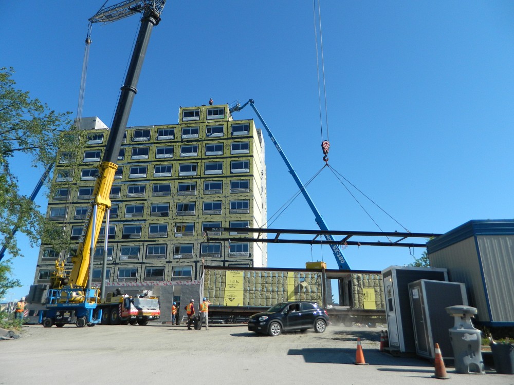 Toujours dans l’exemple hôtelier, la finition interne des modules est déjà faite. Les lits, machines à café, bureaux, toilettes, bains, douches, comptoirs, tout est déjà en place. Et il y a plusieurs autres avantages dans une telle structure modulaire. Comme les modules sont construits directement en usine puis transportés sur les sites de construction, on a besoin de moins de main-d’œuvre, l’environnement est mieux contrôlé, les produits sont standardisés, et le temps de construction diminue. L'érection du bâtiment se fait beaucoup plus rapidement une fois sur le site, et il y a beaucoup moins de déchets produits, moins de nuisances sonores environnantes et moins de trafic routier dans le voisinage.