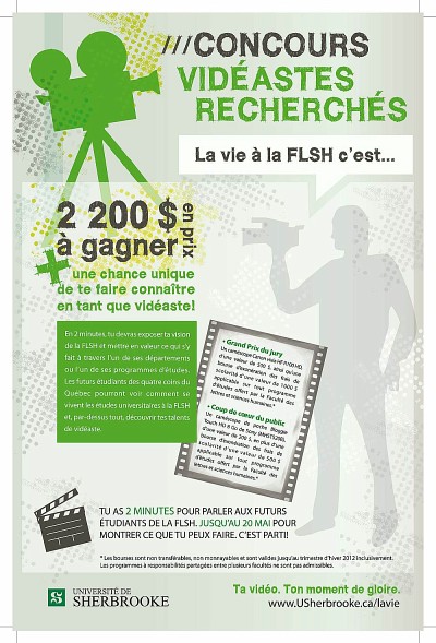 La Faculté des lettres et sciences humaines a lancé avec fracas, le 22 février, un concours vidéo auprès de sa population étudiante, afin de dénicher des vidéastes talentueux fréquentant l'UdeS. Des cartons promotionnels, semblables à des billets de 20 $, ont été déposés partout dans la faculté pour faire réagir les gens et les attirer sur le site Web de l'événement. Mission accomplie! Plus de 250 clics ont été enregistrés après une seule journée de promotion.
