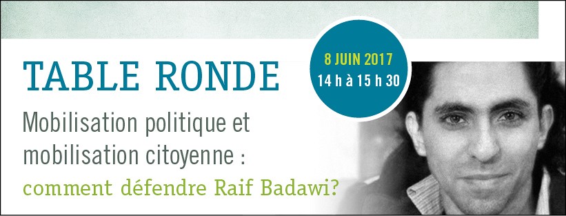 Mobilisation politique et mobilisation citoyenne : comment défendre Raif? Réunis autour de ce thème, différents intervenants sont invités à exposer leur point de vue sur ces questions et à échanger avec l’auditoire dans le cadre d’une table ronde qui aura lieu le 8 juin à 14 h au balcon du foyer Mont-Orford du Centre Culturel de l'Université de Sherbrooke. La mobilisation politique et la mobilisation citoyenne sont-elles complémentaires ou se font concurrence? Quels sont les rôles des diplomates et des instances gouvernementales? Y a-t-il une limite à la mobilisation citoyenne? Les médias contribuent-ils positivement ou nuisent-ils au dialogue? Quelles sont les limites des lois lorsqu'il est question de liberté d’expression?