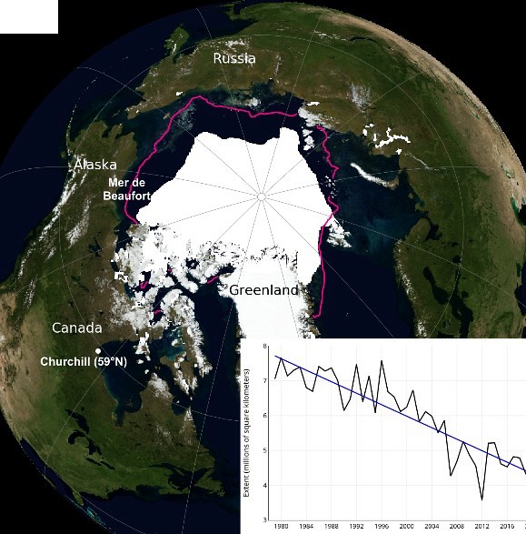 Étendue de la glace de mer arctique en septembre 2019, au moment où elle est minimale, dérivée des observations satellites. La ligne magenta indique la limite moyenne sur la période 1981-2010. En médaillon, la tendance de sa superficie du mois de septembre en millions de kilomètres carrés de 1979 à 2019, entre le maximum de 7.5 M km2 en 1980 et la valeur de 4.3 M km2 observée en septembre 2019. Source National Snow and Ice Data Center, NASA.