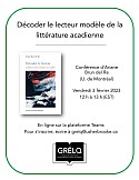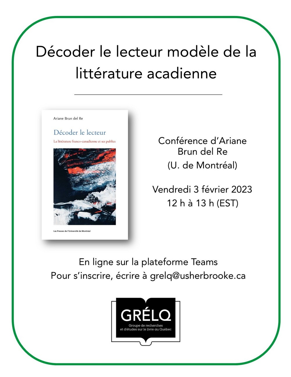 Le Groupe de recherches et d'études sur le livre au Québec (GRÉLQ) vous invite à la conférence d'Ariane Brun del Re (U. de Montréal), qui s’intitule « Décoder le lecteur modèle de la littérature acadienne », et qui aura lieu le vendredi, 3 février 2023, de 12 h à 13 h (EST). L’événement se déroulera en ligne sur la plateforme Microsoft Teams. Les personnes intéressées doivent s’inscrire préalablement en remplissant le formulaire suivant : https://forms.gle/aj96zYSCLSgJ23Kb9