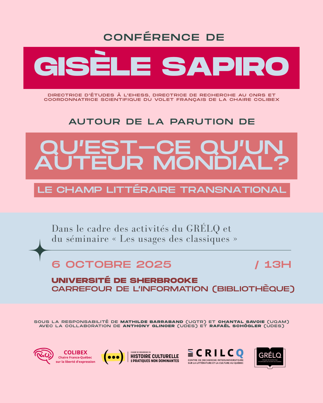 Organisée par Anthony Glinoer (U. de Sherbrooke, codirecteur du GRÉLQ) et Rafael Schögler (U. de Sherbrooke), cette activité s'inscrit dans le cadre du séminaire « Les usages des classiques ». Elle fait partie de la série de conférences de Gisèle Sapiro au Québec, sous la responsabilité de Mathilde Barraband (UQTR) et Chantal Savoie (UQAM), en collaboration avec la Chaire France-Québec sur la liberté d'expression (COLIBEX), la Chaire de recherche en histoire culturelle des pratiques non dominantes et le Centre de recherche interuniversitaire sur la littérature et la culture au Québec (CRILCQ).