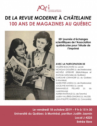 La journée d’étude De La Revue moderne à Châtelaine : cent ans de magazines au Québec aura lieu le vendredi 18 octobre prochain, au local J-4225 de l’Université du Québec à Montréal. Elle réunira des chercheurs de disciplines variées, qui aborderont des périodiques tous plus différents les uns des autres, tels que Paysana, Gastronomie et La Revue moderne, fondée en novembre 1919, qui souligne cette année ses cent ans d’existence. Ouvert à toutes les approches disciplinaires pertinentes (études littéraires et culturelles, histoire, communication, sociologie, etc.), l’événement sera l’occasion d’échanger collectivement autour d’un type de périodique populaire, le magazine, et de plusieurs titres significatifs de son évolution dans l’histoire des médias.