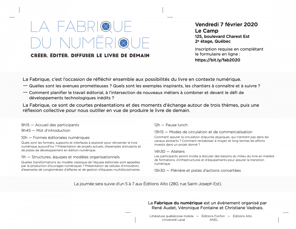 Le 7 février prochain se tiendra la Fabrique du numérique à Québec. Il s’agit d’un événement qui réunira plusieurs éditeurs, chercheurs et gens du livre dans le but de réfléchir aux écueils, mais aussi aux bonnes pratiques qui se développent actuellement dans l’édition de livres numériques.