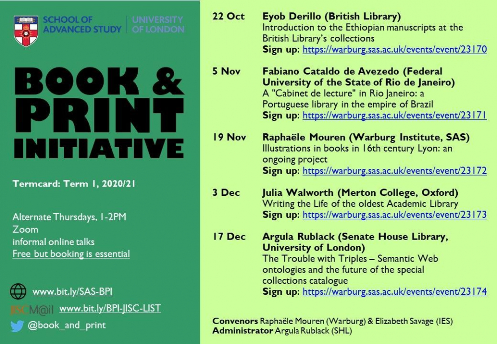 Book & Print Initiative (U. of London) annonce son cycle de conférences virtuelles pour l’automne 2020. Les conférences, qui ont lieu un jeudi sur deux, sont gratuites et ouvertes à tous, mais l'inscription au préalable est obligatoire.