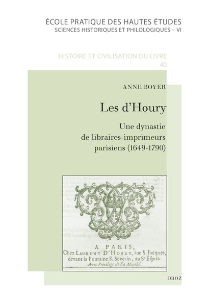 Le livre Les d'Houry. Une dynastie de libraires-imprimeurs parisiens, éditeurs de l'Almanach royal et d'ouvrages médicaux (1649-1790) d’Anne Boyer vient de paraître à la librairie Droz dans la collection « Histoire et civilisation du livre ».