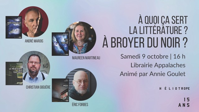 Pour souligner son 15e anniversaire, la maison d'édition Héliotrope organise un programme de rencontres autour de la question « À quoi ça sert la littérature ? » La 2e séance aura lieu à la librairie Appalaches de Sherbrooke le 9 octobre prochain. Animée par Annie Goulet, la discussion réunira Éric Forbes, Christian Giguère, André Marquis et Maureen Martineau.