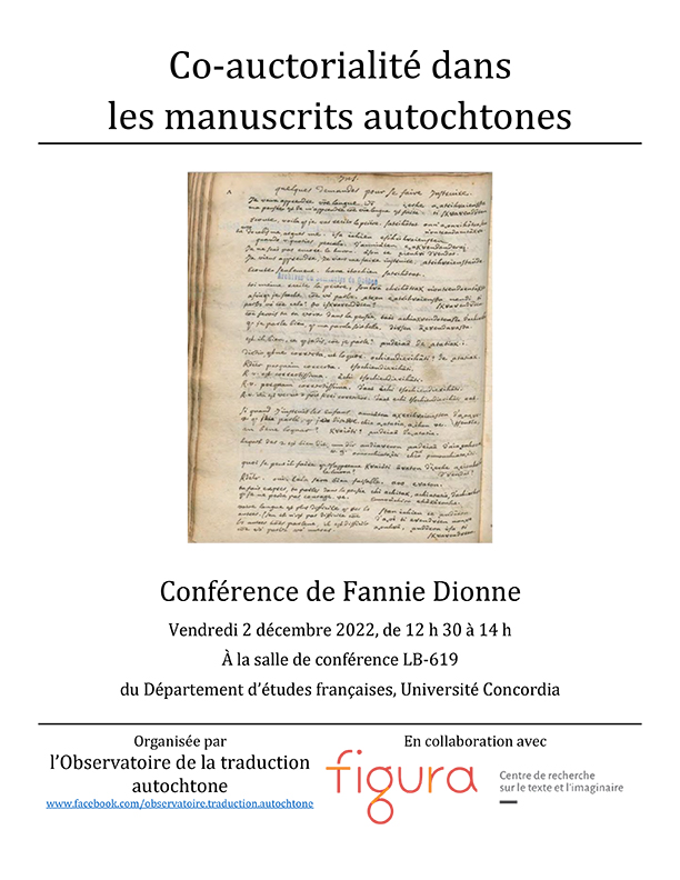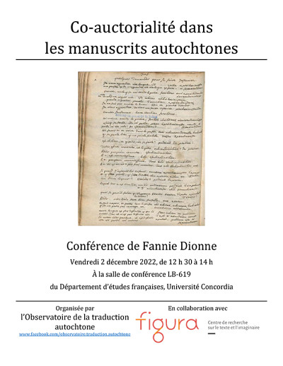 L'Observatoire de la traduction autochtone, en collaboration avec Figura - Centre de recherche sur le texte et l'imaginaire, organisent la conférence « Co-auctorialité dans les manuscrits autochtones », offerte par Fannie Dionne. L'événement aura lieu le 2 décembre, de 12 h 30 à 14 h au local LB-619 de l'Université Concordia.