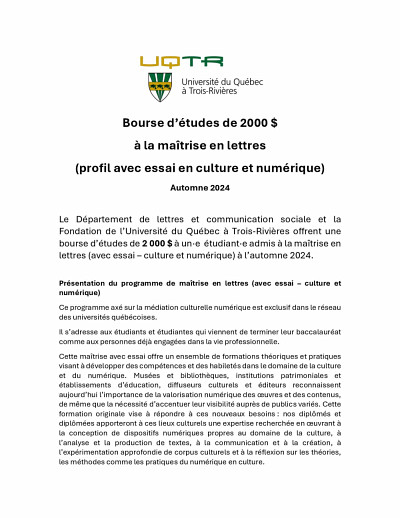 Le Département de lettres et communication sociale, section lettres - UQTR offre une bourse d’études de 2000$ pour recruter à l’automne 2024 une personne étudiante à la maîtrise en lettres avec essai - profil culture et numérique.