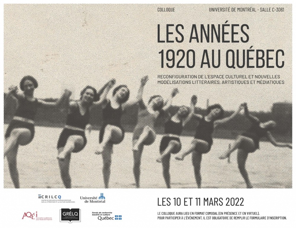Les 60e journées d’échanges scientifiques de l’AQÉI, intitulées « Les années 1920 au Québec : reconfiguration de l'espace culturel et nouvelles modélisations littéraires, artistiques et médiatiques », auront lieu en format co-modal les 10 et 11 mars prochain. L’événement, organisé par Stéphanie Bernier, Vanessa Blais-Tremblay, Caroline Loranger et Adrien Rannaud, se déroulera à la salle C-3061 de l’Université de Montréal et en ligne sur Zoom. Pour obtenir le lien Zoom, il faut remplir le formulaire ici.