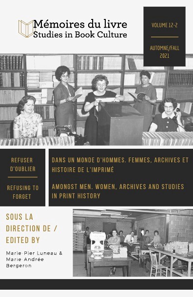 Le nouveau numéro (vol. 12, no 2) de la revue Mémoires du livre / Studies in Book Culture, intitulé « Refuser d'oublier. Dans un monde d'hommes. Femmes, archives et histoire de l'imprimé » et dirigé par Marie-Andrée Bergeron et Marie-Pier Luneau, vient de paraître et est désormais accessible sur la plateforme Érudit.