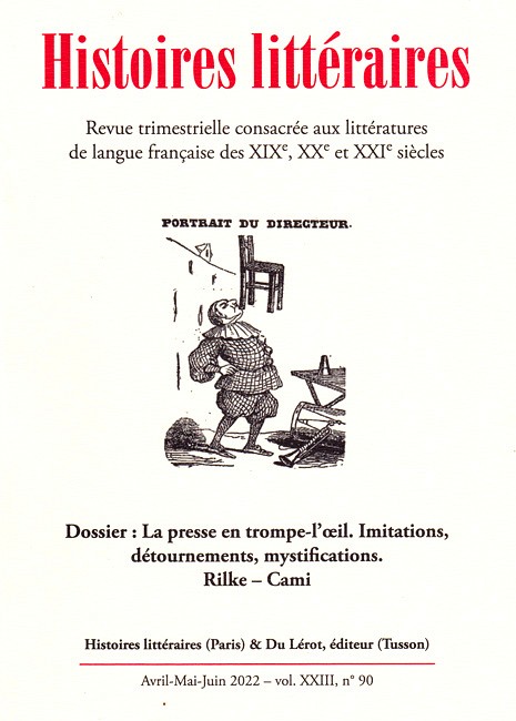 Le nouveau numéro de la revue Histoires littéraires (no 90), intitulé « La presse en trompe-l'oeil. Imitations, détournements, mystifications » et dirigé par Paul Aron et Jean-Didier Wagneur, vient de paraître.