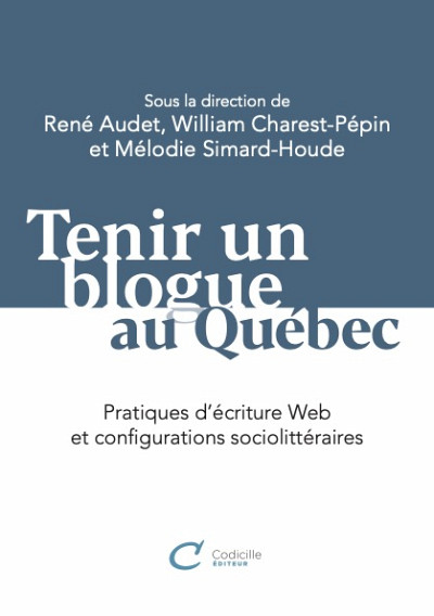 Le livre Tenir un blogue au Québec. Pratiques d'écriture Web et configurations sociolittéraires, dirigé par René Audet (U. Laval), William Charest-Pépin (U. Laval) et Mélodie Simard-Houde (UQTR, cochercheuse du GRÉLQ), vient de paraître chez Codicille éditeur, dans la collection « Écritures actuelles ».