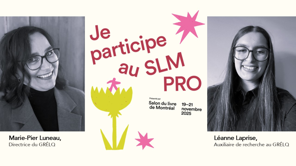 Dans le cadre du Salon du livre de Montréal, Marie-Pier Luneau (U. de Sherbrooke, directrice du GRÉLQ) et Léanne Laprise (U. de Sherbrooke, membre du GRÉLQ) participeront à une table ronde mettant à l'honneur le travail des femmes dans le milieu de l'édition au Québec.