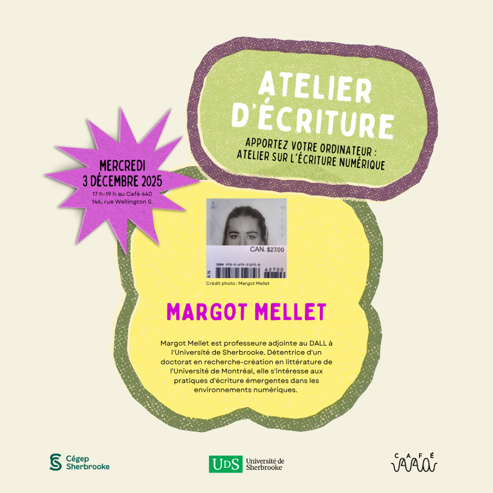 Le mercredi 3 décembre prochain, Margot Mellet (U. de Sherbrooke, cochercheuse du GRÉLQ) sera la troisième invitée de la série d'ateliers d'écriture du DALL, une initiative de Kiev Renaud (U. de Sherbrooke, collaboratrice du GRÉLQ).