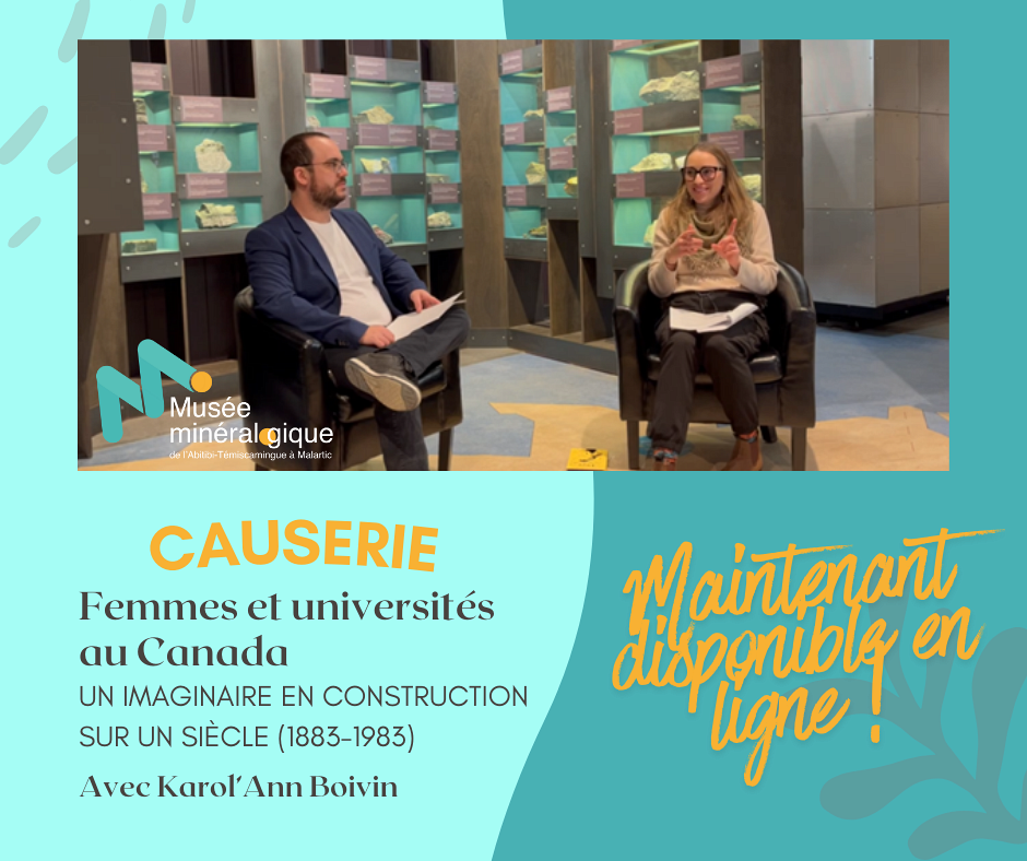 Le 16 janvier 2026, Karol'Ann Boivin, chercheuse postdoctorale à l'Université Queen's et membre du GRÉLQ, était invitée à présenter une causerie au Musée minéralogique de l'Abitibi-Témiscamingue. Sa présentation portait sur la présence des femmes à l'université au Canada, depuis les premières formations médicales réservées aux femmes en 1883 jusqu'à l'autonomisation de l'Université du Québec en Abitibi-Témiscamingue (UQAT) en 1983.