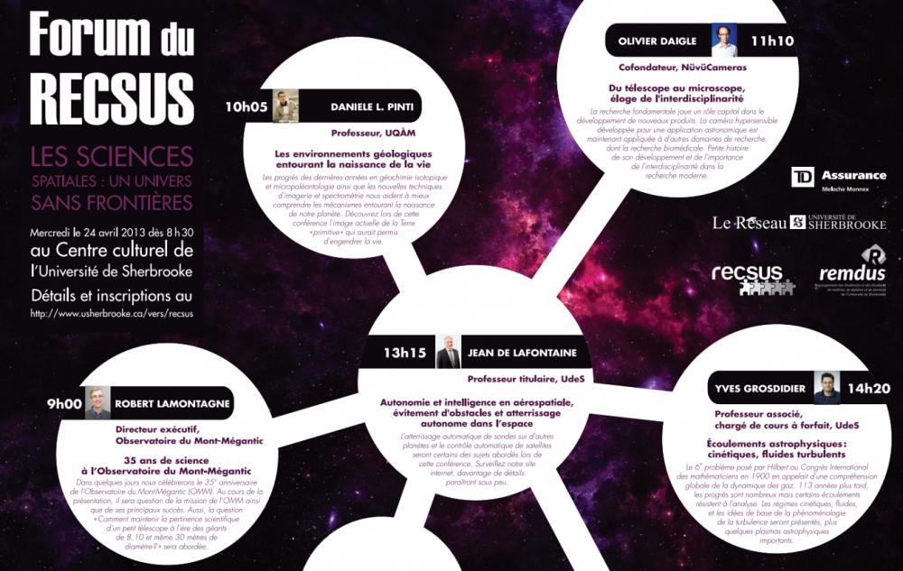 Une centaine de personnes ont pris part au 6e Forum de la recherche du Regroupement des étudiants-chercheurs en sciences de l'Université de Sherbrooke (RECSUS), qui se tenait mercredi dernier au Centre culturel de l’UdeS. Cette année, les conférences s’orientaient autour de la thématique Les sciences spatiales, un univers sans frontières.