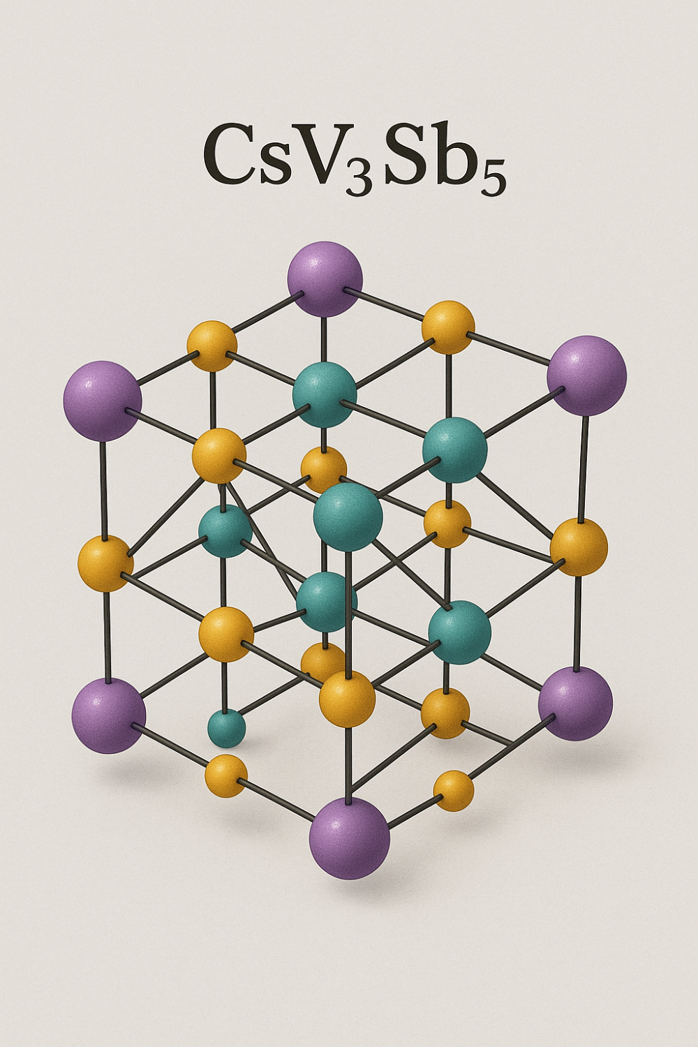 Représentation tridimensionnelle du réseau cristallin du composé CsV₃Sb₅ (césium vanadium antimonide). Le violet représente les atomes de césium (Cs); le turquoise, ceux de vanadium; et les jaunes, ceux de l'antimoine. Ce modèle illustre l’arrangement atomique typique de la famille des métaux kagomés, où les atomes de vanadium forment un réseau responsable des propriétés électroniques particulières du matériau.