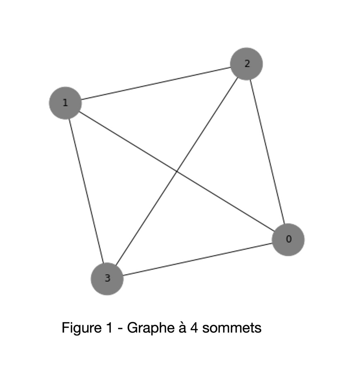 Avec le développement actuel de l’ordinateur quantique, on peut explorer une méthode pour résoudre le problème du coloriage. Dans le cas présent, on associe 2 qubits à chacun des 4 sommets pour un total de 8 qubits. Les 4 états de base de chacune des paires de qubits peuvent alors être associés aux 4 couleurs comme dans le tableau 1 dessous: