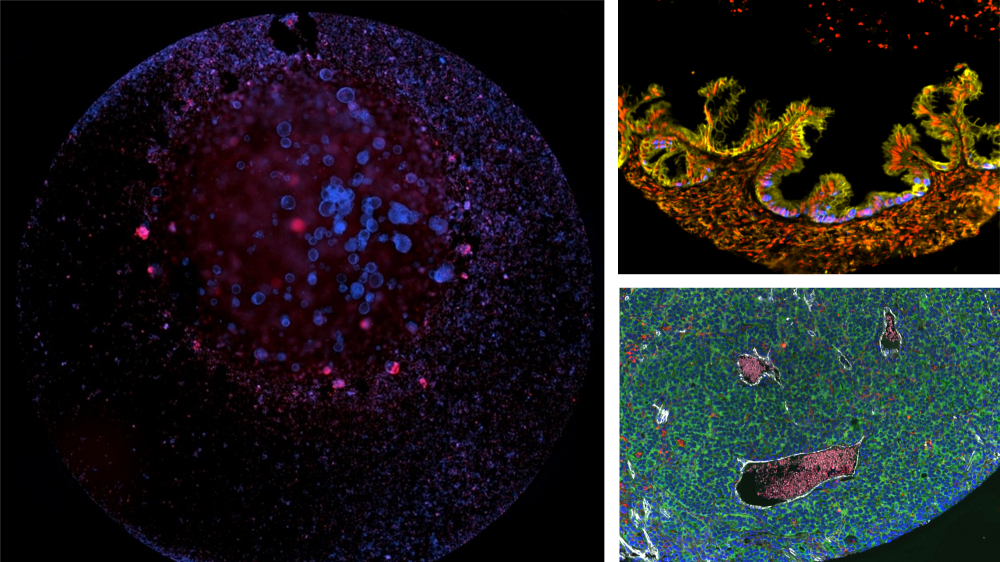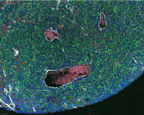 Sur cette image, l’immunofluorescence cyclique révèle le vrai visage du cancer ovarien. Le marquage vert cible les cytokératines exprimées fortement par les cellules cancéreuses, organisées en une marée dévastatrice. En blanc, des vaisseaux gorgés de cellules sanguines en rose se dessinent sous forme d’œil et bouche formant le visage de ce cancer. La vascularisation nourrit l’espoir d’une percée thérapeutique et offre une entrée pour les cellules immunitaires, que l’on voit en rouge, présentes pour combattre le cancer. Mais elle représente également une opportunité pour les cellules cancéreuses de quitter la tumeur et former des métastases.