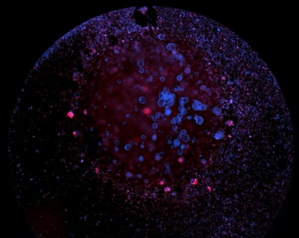 Cette image ressemble à une lune toute droit sortie d’un conte, avec un grand cratère au milieu. Mais surprise! Ce n’est pas l’espace qu’on explore, c’est une coculture de cellules cancéreuses et de cellules immunitaires. Les cellules forment un paysage lunaire inattendu, où la lutte entre deux mondes se joue en silence. Un clin d’œil poétique à la recherche scientifique, où même les combats microscopiques peuvent ressembler à des merveilles célestes.