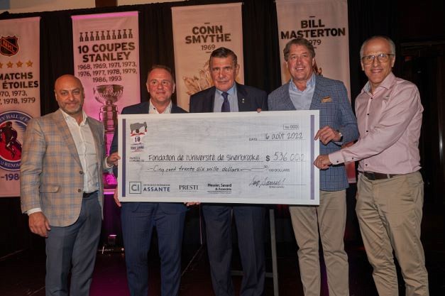 Sur la photo principale, de gauche à droite : Paolo Presti, vice-président, Presti Demeures et Développement; Peter Pomponio, président, Assante Dorval, et directeur général, Assante Québec; Serge Savard, ex-capitaine et directeur général des Canadiens de Montréal; Mario Messier, Messier Savard & Associés Inc. Affaires immobilières.