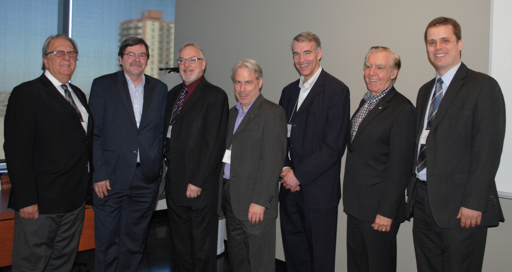 Sont présents sur la photo (de gauche à droite) : Gilles Côté, président-directeur général, Développement économique Longueuil; Mario Deslongchamps, directeur général, Service d’appui au Campus de Longueuil de l’UdeS; Maurice Duval, directeur scientifique, CQRDA; François Racine, président, Alcoa Innovation; Alain Desrochers, titulaire de la Chaire CRSNG en conception pour l’aluminium, UdeS; Jean-Louis Fortin, agent de liaison, CQRDA; Sylvain Vachon, Chaire CRSNG en conception pour l’aluminium, UdeS.