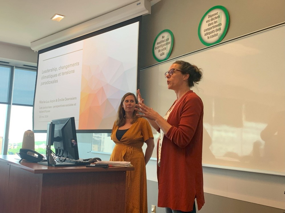 Bien que le colloque soit une initiative de l'École de politique appliquée, plusieurs membres d'autres facultés de l'UdeS étaient présents. Ici, la présentation de la professeure Marie-Luc Arpin (École de gestion de l’Université de Sherbrooke) et son étudiante au doctorat Émilie Desrosiers (École de gestion de l’Université de Sherbrooke).