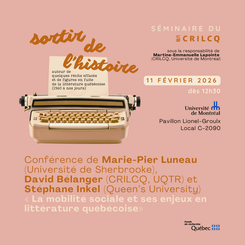 Le 11 février prochain, Marie-Pier Luneau (U. de Sherbrooke, directrice du GRÉLQ), David Bélanger (UQTR) et Stéphane Inkel (U. Queen’s) présenteront une conférence sur « La mobilité sociale et ses enjeux en littérature québécoise ».