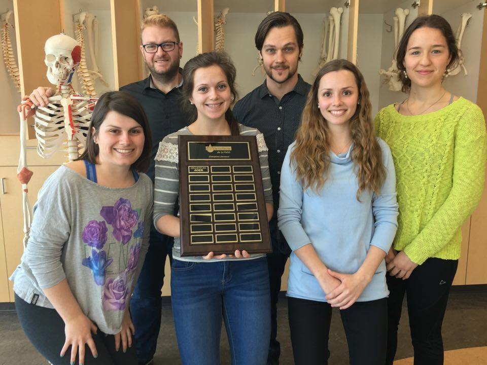 De gauche à droite, différents membres du comité exécutif de l’AGER : Lorie Comtois (Secrétaire) - Frédérick Fournier (VP représentant à la FEUS) - Véronique Thivierge (Trésorière) - Antoine Laramée (VP à la vie étudiante et Coordonnateur de la collecte de sang de la FMSS) - Laurie-Anne Pelletier (VP aux affaires académiques en ergothérapie) - Kimberly Borwick (VP au développement durable).