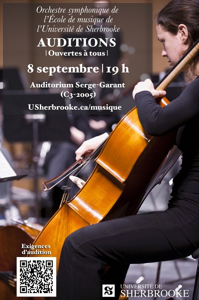 Les auditions pour l’année 2014-2015 auront lieu le 8 septembre à 19 h à l’auditorium Serge-Garant (C3-2005). Les personnes intéressées doivent obligatoirement confirmer leur présence par courriel à etudes.musique@usherbrooke.ca.