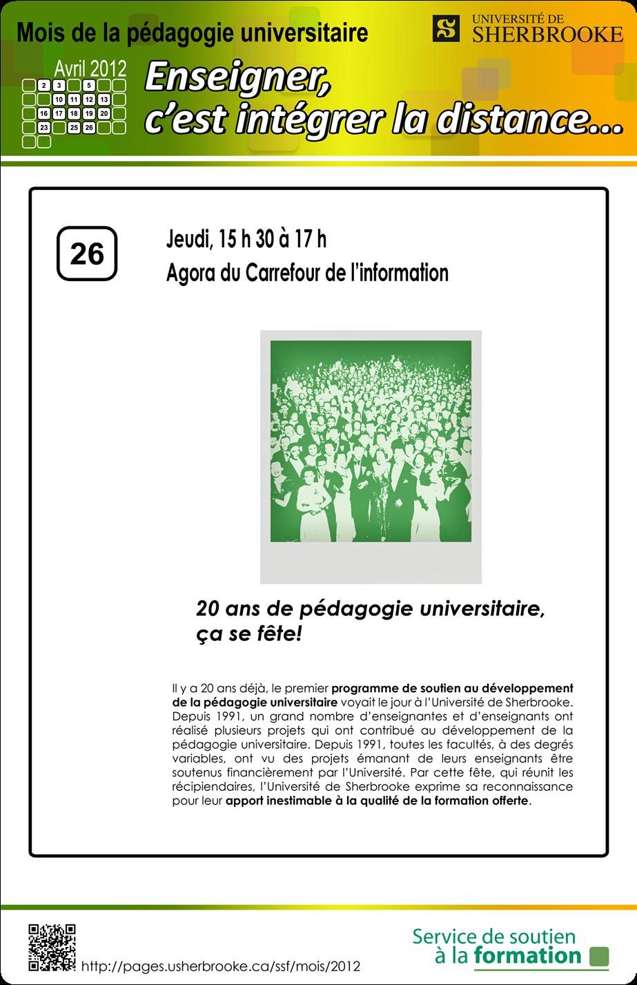 Le premier programme de soutien au développement de la pédagogie universitaire a 20 ans déjà. Lors d’une fête organisée par le vice-rectorat aux études de l’Université de Sherbrooke le 6 décembre dernier, un cahier répertoire des 354 projets a été remis aux invités. Ce sont 390 personnes qui ont bénéficié de ce programme pour un total de 2,3 M$ en 20 ans! PERFORMA en a déposé et obtenu 8 projets au fil des ans dont voici les intitulés :