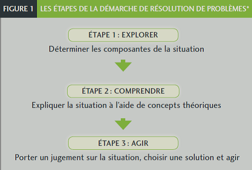 Cette démarche de résolution de problèmes ne comporte que trois étapes simples: explorer, comprendre et agir, de sorte qu’elle puisse être utilisée quotidiennement par le personnel enseignant dès qu’un problème se présente. La priorité dans une telle démarche est de pousser plus loin la réflexion et de pouvoir prendre une distance par rapport à l’événement, de rationaliser et de tirer ainsi des conclusions plus justes.